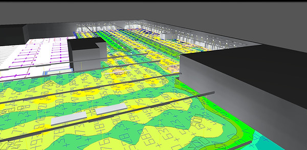 Plans d’éclairement : niveaux de Lux, uniformités et zones critiques.